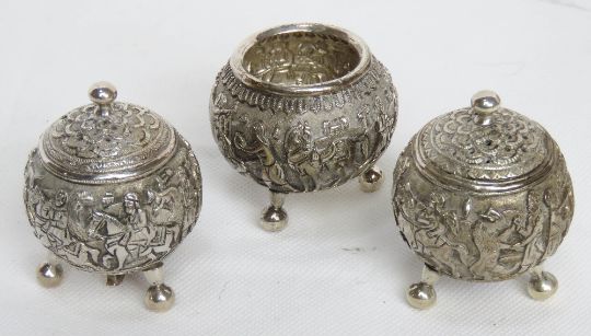 A white metal cruet set having heavily carved decoration throughout, 178.2g.