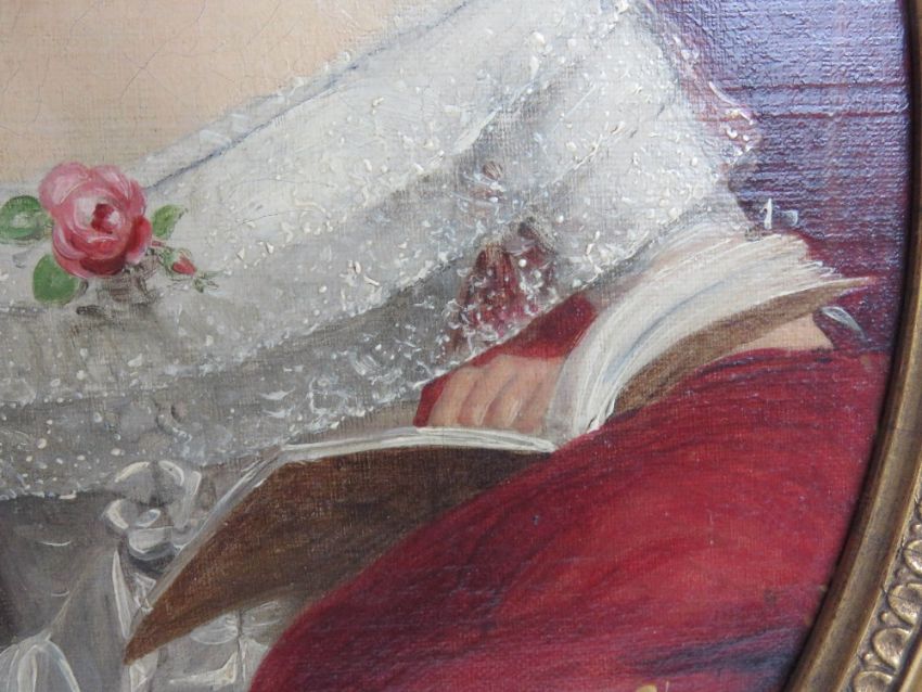 A 19th century oil on canvas of a lady in white dress with floral adornment studiously ignoring a man disturbing her whilst reading, a fine study, no apparent signature, in oval frame. Sight size approx. 26.5 x 30.5cm.