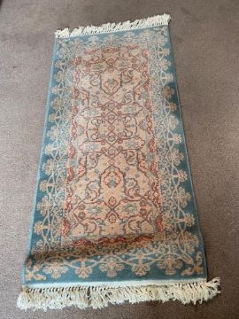 A wool rug in green and sand ground measuring 68 x 134cm.