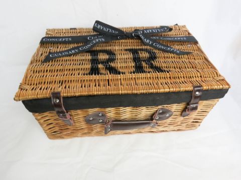 A Culinary Concepts for Rolls Royce picnic hamper with leather straps and black fabric lining.