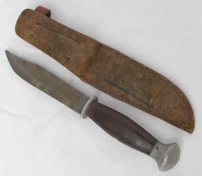 A hunting knife in leather sheath.