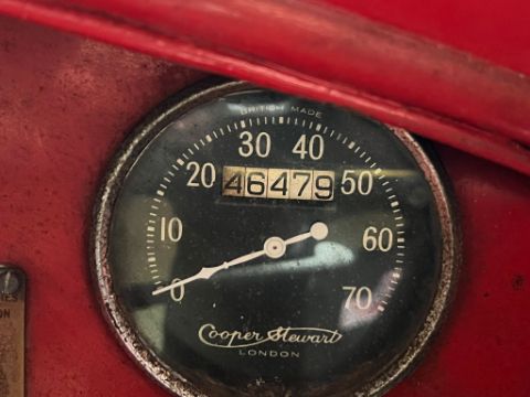 Red with Brooke Bond Tea livery, black leatherette bench seat. Cracked window.