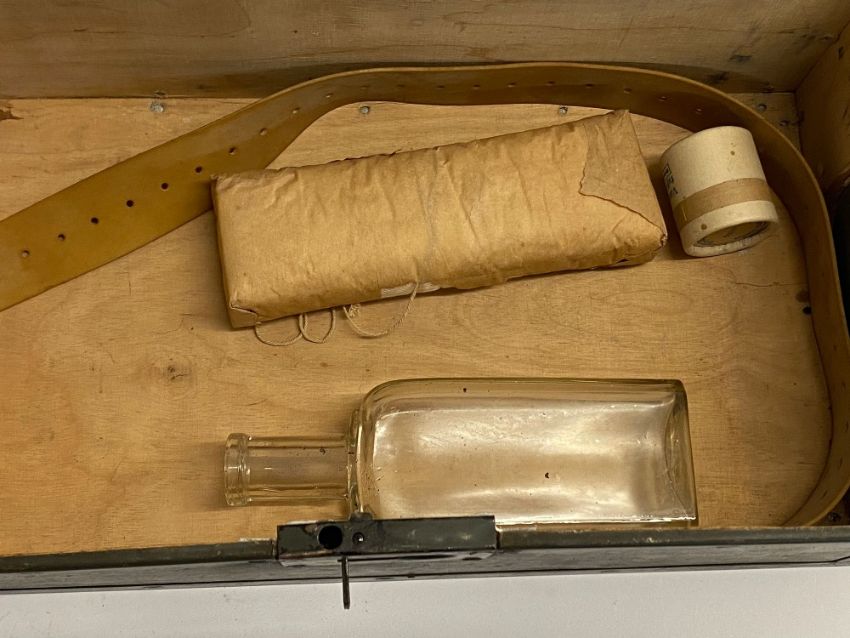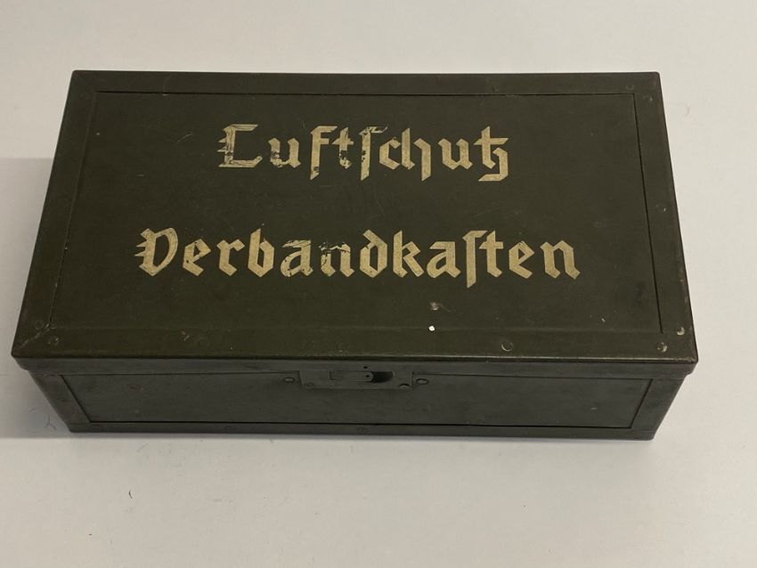 A WWII German Luftschutz first aid box with accessories, original label within. This lot will be available to collect in person 48 hours after the end of the sale. Please contact the office admin@humbertellis.com for collection appointments / postage quotes / courier information.
