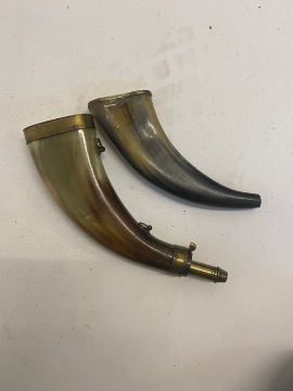 Two horn and brass powder flasks. This lot will be available to collect in person 48 hours after the end of the sale. Please contact the office admin@humbertellis.com for collection appointments / postage quotes / courier information.