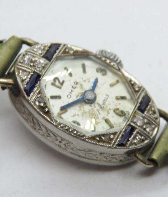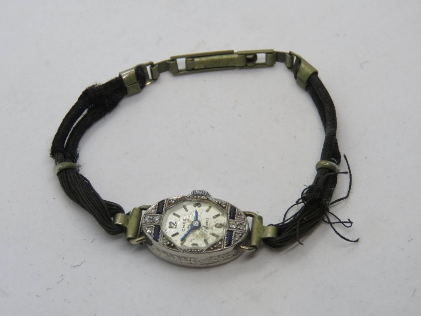 A delightful Art Deco platinum diamond and sapphire ladies cocktail watch, the oval case having octagonal bezel and geometric pattern upon, marked platinum, the dial marked Omer 17 jewels Swiss, having blued steel hands, on Netonia rhodium plated and silk cord strap a/f.