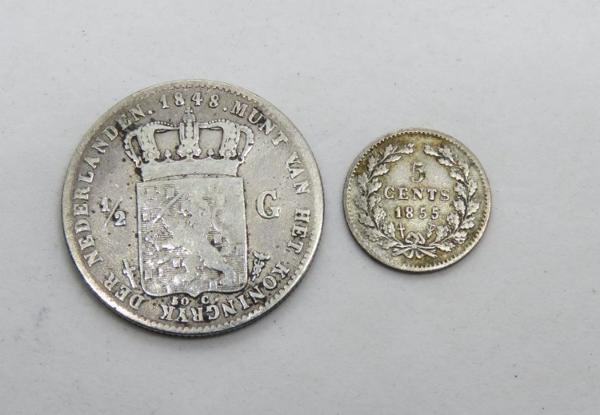 A Netherlands Willem II 1848 1/2G 0.945 silver, and 1855 5 cent .640 silver. Together with a quantity of Netherlands 10 cent and 25 cent coins c1914-41, 0.640 silver. Total weight 93.7g.
