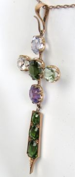 Suffragette Jewellery; an early 20th century gem set crucifix - the combination of the stones in this piece of jewellery represent the colour scheme of the Suffragette Movement as devised by Emmeline Pethwick-Lawrence to signify loyalty and dignity (purple), hope (green) and purity (white). The cross having five claw set tourmaline gemstones (green, light green, white, purple and purple tint) the articulated lower section set with further green tourmaline gemstones. On a 9ct gold chain. Pendant measuring 6.6 x 2.6cm inc hook removable bale. Central stone 7.4 x 6.7 x 4.4mm (approx 1.5ct), cardinal point stones each measuring approx 6.5 x 5 x 3.5mm (each approx 0.8ct). Total weight 5.4g. In contemporary presentation box.