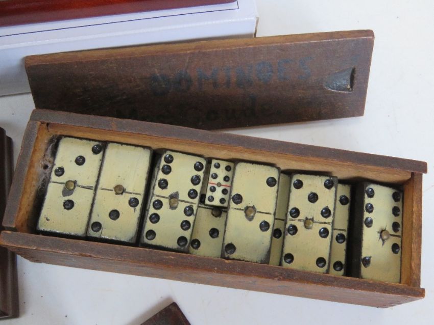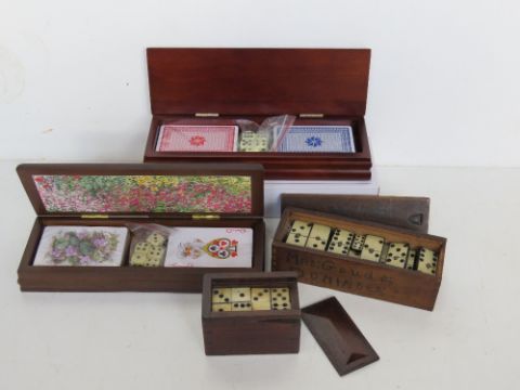 Two contemporary bridge playing cards boxes together with two vintage sets of dominoes.