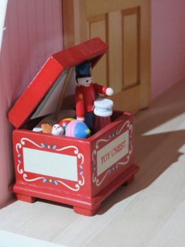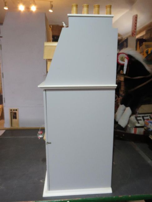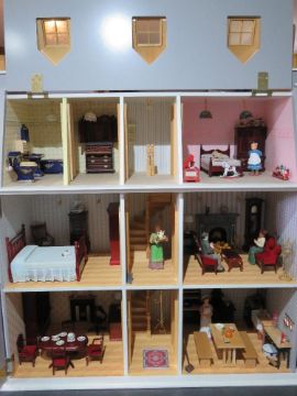 A 'Victorian Manor' dolls house with dining room, sitting room, nursery with child, servants and family figures, potted plants to front and weather vane to roof (please see images - loose). Measuring approx 80 x 33 x 84cm.