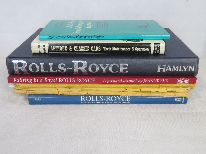 A quantity of Rolls-Royce themed books including Rallying in a royal Rolls-Royce by Jeanne Eve.