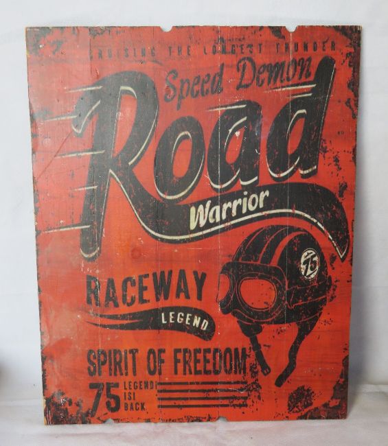 A contemporary printed wooden motorbike themed sign