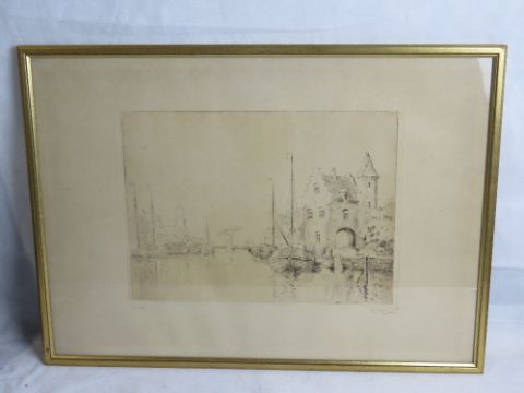 Signed print; boats on a river, houses beyond, signed indistinctly lower right Van T???, framed and glazed.