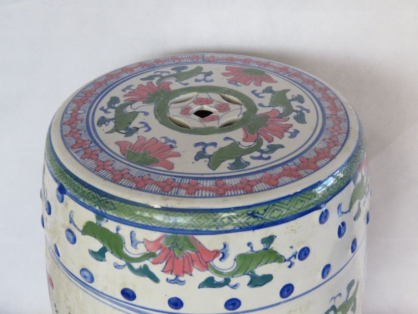 A Chinese style ceramic stool, white ground with pink butterflies upon.