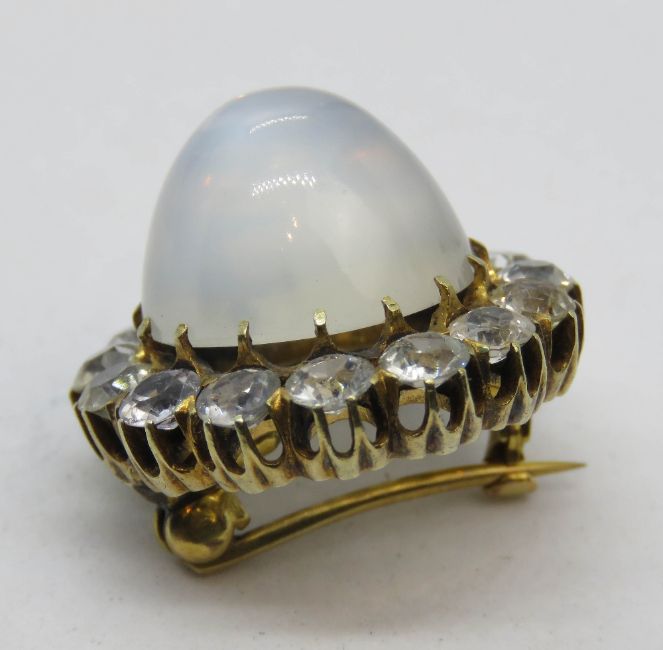 An antique Victorian moonstone and white sapphire brooch, the domed moonstone approx 13 x 13 x 10, surrounded by fifteen round cut sapphires each approx 0.15ct, approx 2.1cm dia, 9.7g.