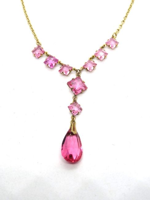 An early 20th century pink paste stone necklace, stamped 9ct to the clasp, delightful geometric form. square cut stones terminating in a teardrop.