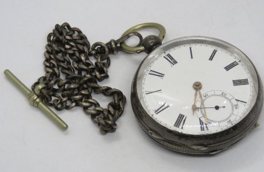 A hallmarked silver Waltham Mass, pocket watch having open face, white enamel dial, subsidiary seconds dial, key wind movement, HM for Birmingham 1885, with guard chain. Total weight 135.3g.