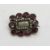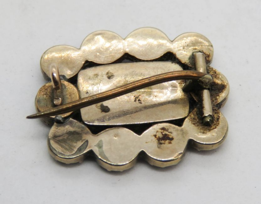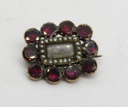 A Georgian mourning brooch having ten foil backed garnet stones around a glazed panel containing a lock of hair, seed pearl border, one pearl deficient, 2 x 2.4cm, 3.9g.