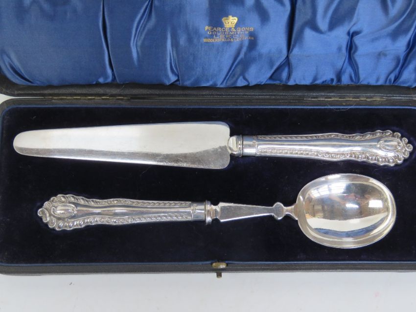 A delightful serving set comprising cake knife and dessert spoon, each having hallmarked silver handle, presented within a fitted case.