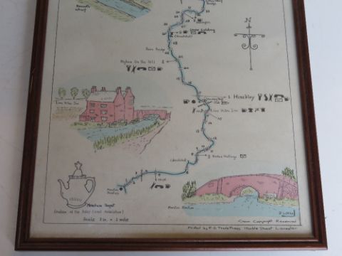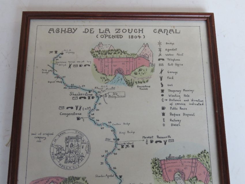 A strip map of Ashby De La Zouch canal, printed from a pen and ink by J Little, framed and glazed measuring approx 44.5 x 24cm overall.