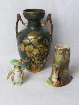 A Beswick Beatrix Potter Benjamin Bunny, gold stamp, together with a black ground vase and a rabbit vase. Three items.
