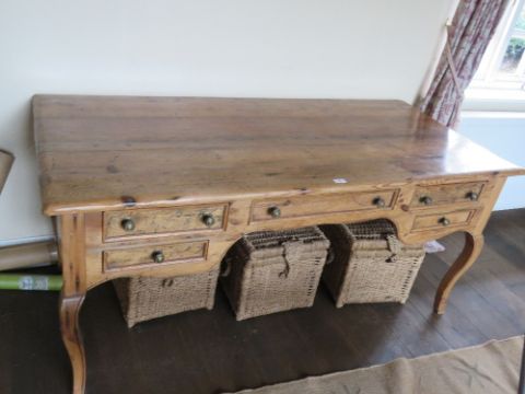 An impressive pine desk or side table having central frieze drawer flanked by drawers to each side, 170 x 77 x 75cm.
