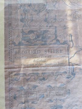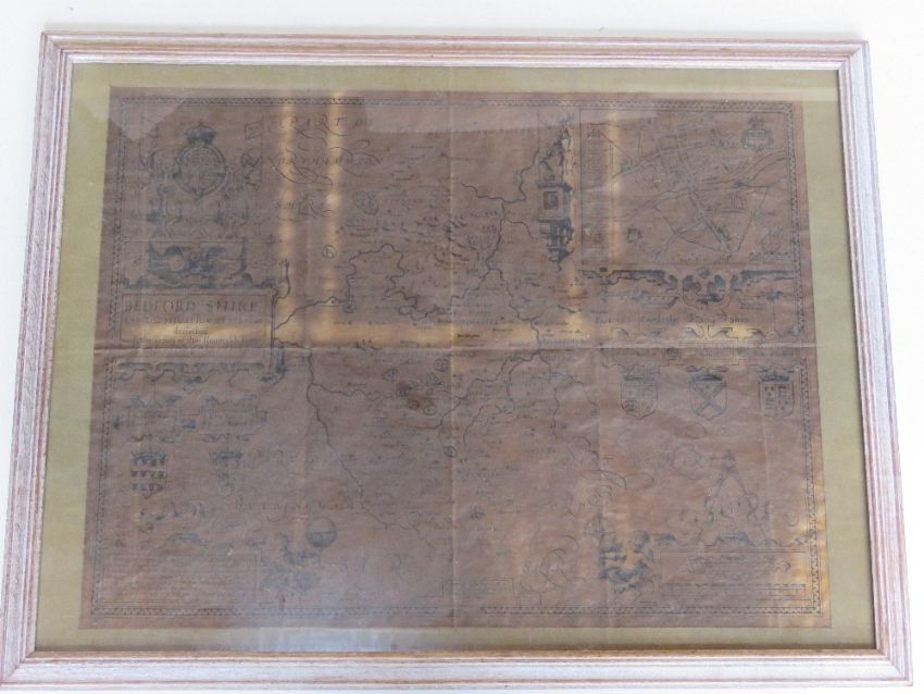 Map of Bedfordshire by John Speed, having Arms of the Honourable Families upon, folds noted, mounted and in contemporary frame, sight size approx 45 x 34.5m, overall approx 54.5 x 42cm.
