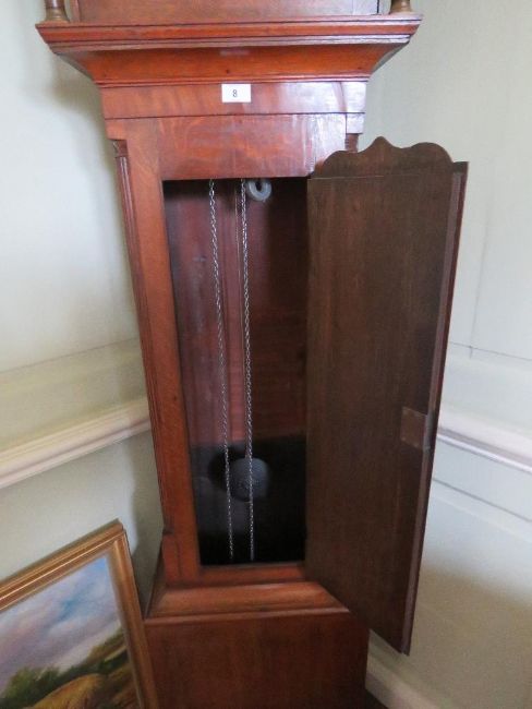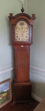 A 19th century 30 hour long case clock, arch top painted dial with Roman numerals, marked Ben' Bothamley, Boston. Having subsidiary date dial, standing 88" high.