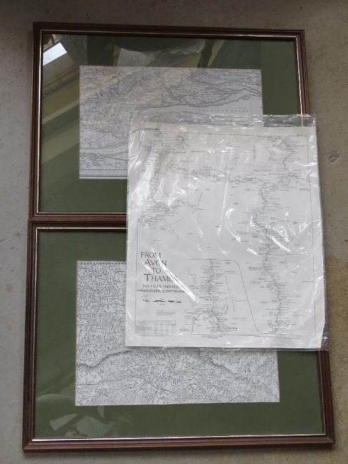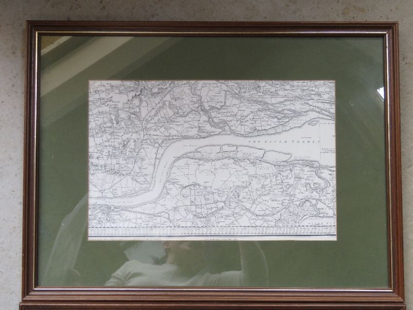 A pair of Ordnance Survey maps being Surrey/Essex in matching frames, mounted, each sight size approx 39.5 x 25cm, each overall size approx 60 x 44.5cm. Together with Lockmaster's map from Avon to Thames No.17. Three items.