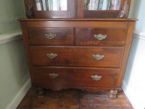 A late Victorian bookcase on chest, pediment top over twin glazed doors having shelves within, base having two short over two long drawers, 112 x 48 x 210cm.