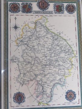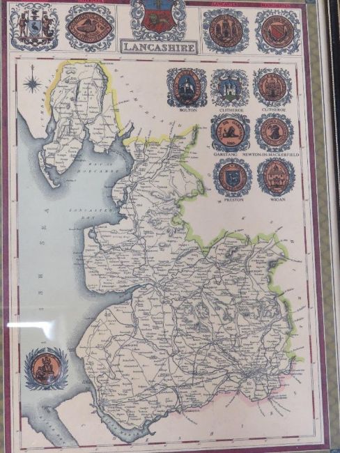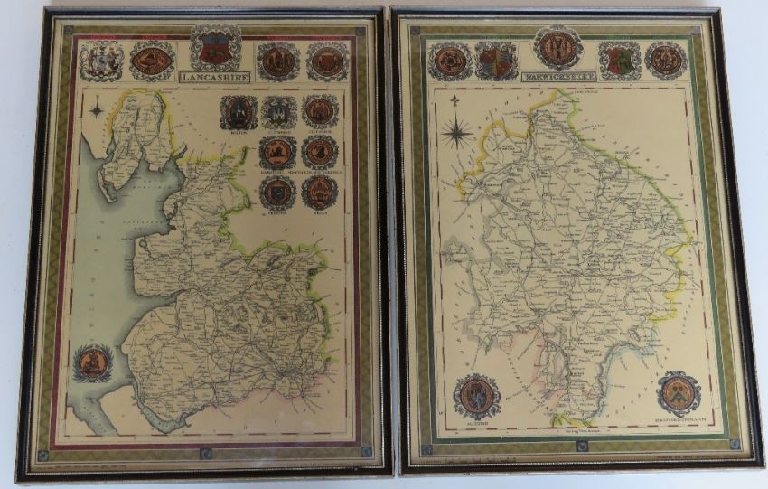 Prints of Lancashire and Warwickshire engraved for Lewis' topographical dictionary, each within matching Hogarth style frames, each measuring approx 29 x 40.5cm overall.