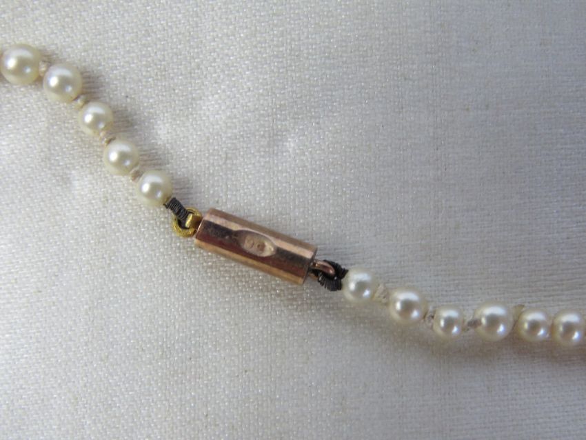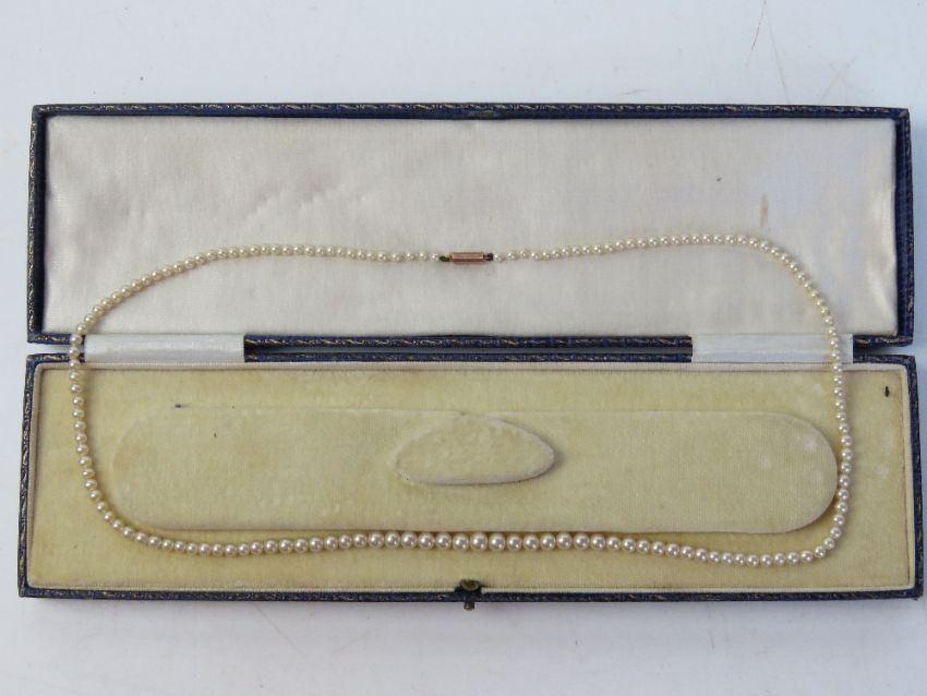 A vintage single strand faux pearl necklace having 9ct gold clasp in associated box.