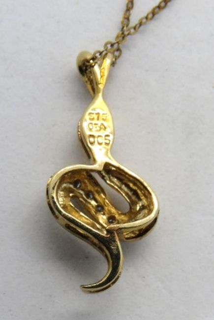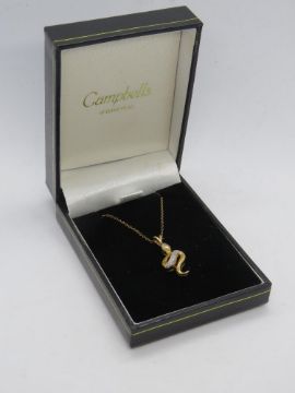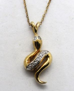 A 9ct gold and diamond snake pendant on fine 9ct gold chain, within presentation box.