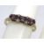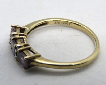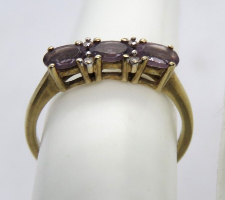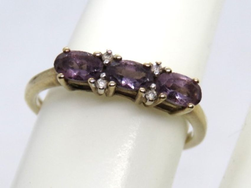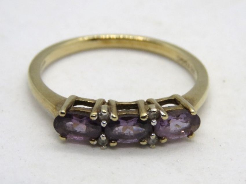 A 9ct gold amethyst and diamond ring, the three oval cut lilac amethyst seperated by two pairs of diamond, hallmarked 375, size N.