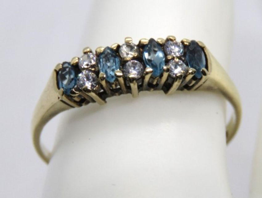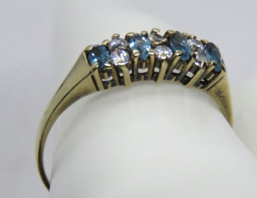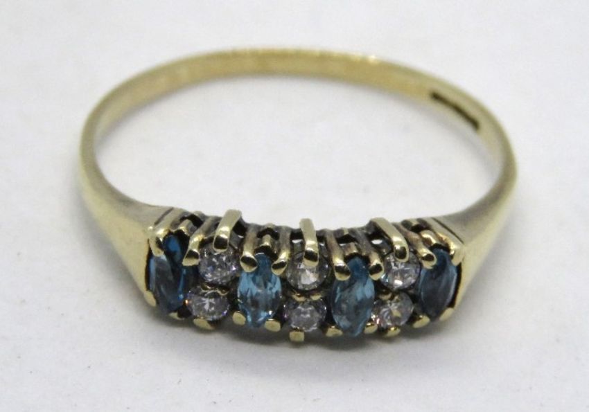 A 9ct gold and aquamarine ring, the four oval cut stones separated by three pairs of white stones, hallmarked 375, size V.