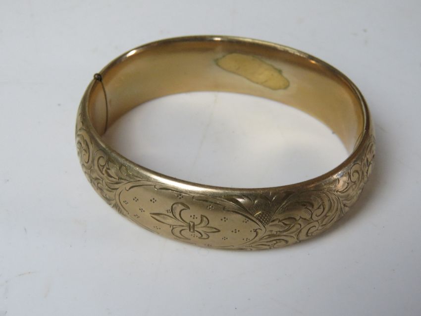 A 9ct gold plated hinged bangle having engraved fleur de lis pattern. Approx 6 x 5.5cm internal diameter. 1.8cm wide.