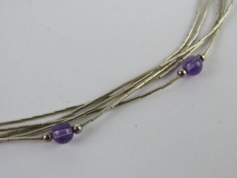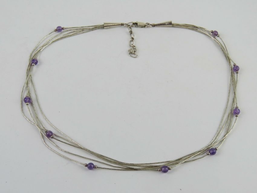 A Sterling silver Native American style five row silver beaded and amethyst necklace.