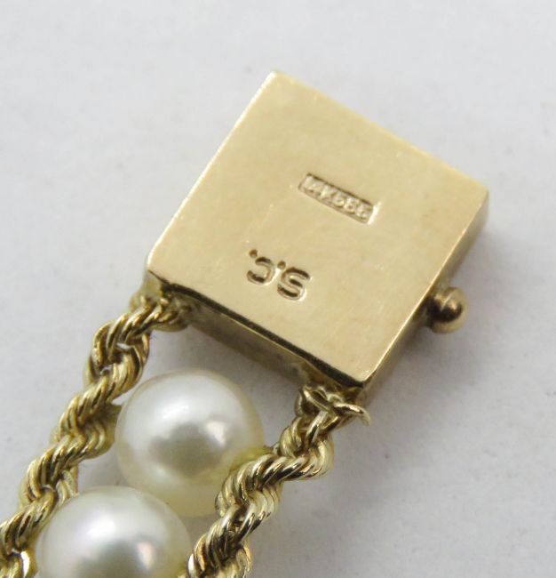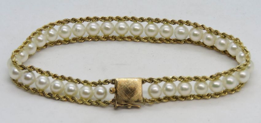 A 14ct gold and pearl bracelet measuring 18cm in length, 11.2g, each of the white pearls approx 5mm dia.