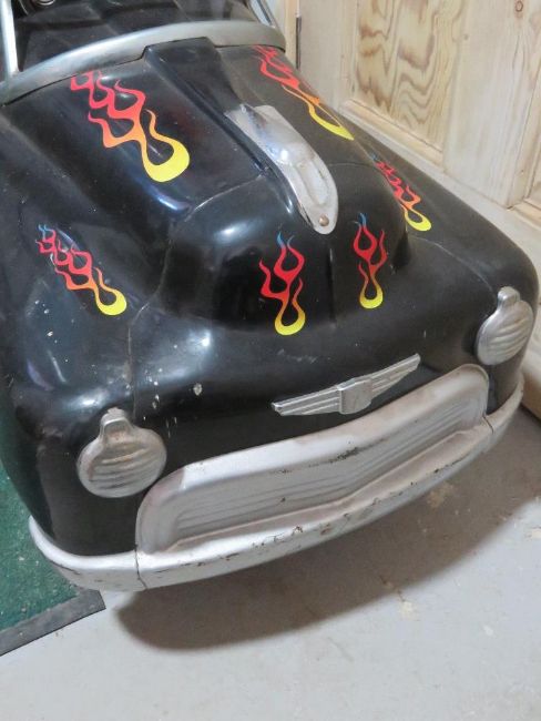 A pedal car modelled as a 1950's Black Hot-Rod Comet.