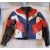 A leather motorcycle jacket by Figo in red white and blue, size 46 chest.