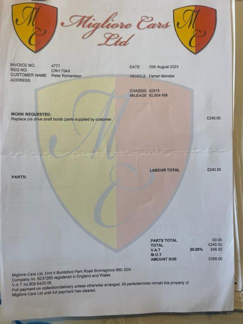 A 1982 Ferrari Mondial QV, ex Silvio Berlusconi The car had been in a museum dedicated to Silvio Berlusconi in Italy for a number of years before being imported to the UK by the previous owner in 2012. Taken to a Ferrari specialist for a major service including cam belt and tensioner replacement. With original alloys having period correct Michelin TRX tyres. Finished in gun metal grey with black hide. A superb looking Ferrari and a fine unmolested example of the marque. Showing 62000 miles (100256kms). Make: Ferrari Model: Mondial QV Registration: CRH 904X Year: 1981 MOT: 09 Aug 2024 V5: Present Former Keepers: 3 Keys: 2 Body Type: Coupe Engine Size: 2927CC Doors: 2 Seats: 4 Exterior Colour: Grey Interior Colour: Black Fuel Type: Petrol Transmission: Five Speed Manual, Left hand RWD Engine No: Not Known Chassis No: ZFFLD14B000042915 This vehicle is located near West Alvington, Devon TQ7 from where it will need to be collected. Videos and Motorscan Report available on request. Viewing is by appointment, please contact the office to arrange. Some vehicles on offer will need some light recommissioning so please assume that your new purchase will need trailering away. We can provide details of a trusted and fully insured logistics partner.