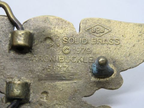 A brass c1979 Baron Buckle 'Deaths Angel' winged skull and crossbones belt buckle.