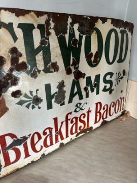 A vintage enamelled advertising sign for Beechwood Hams & Breakfast Bacon, approx 137 x 66cm (54 x 26").