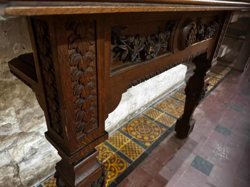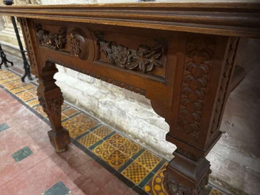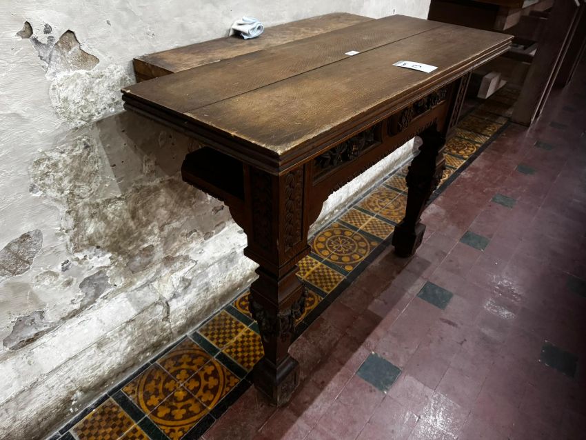 An interesting 19th century oak console table having inset frieze to plank top, carved panels below, the square shaped legs heavily carved and shaped, 45" (114cm) wide x 23.5" (60cm deep x 36" (90cm) high.