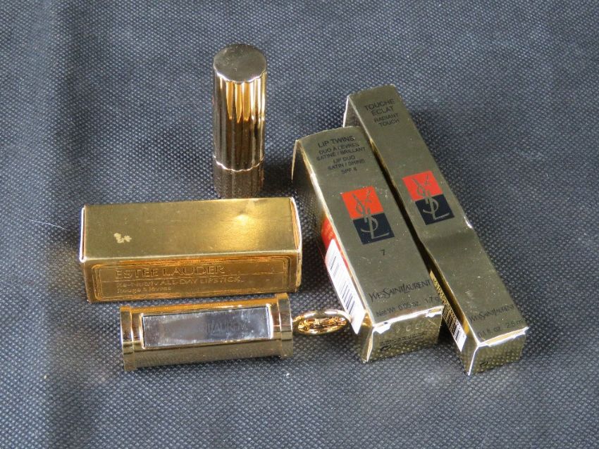 Estee Lauder lipstick and two Yves Saint Laurent items in original packaging.