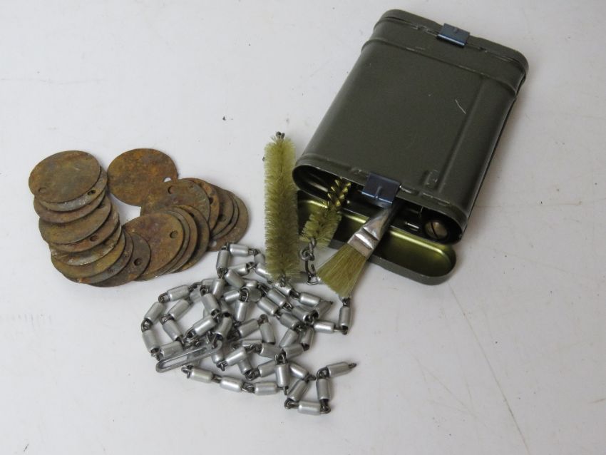 Twenty WWII British dog tags with various names and numbers together with a Mauser/ K98 cleaning kit, oil bottle, pull through and brushes dated 1962 bearing stamp for Rg.f.Gew WBC.