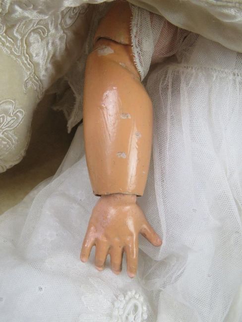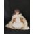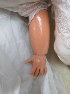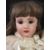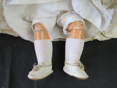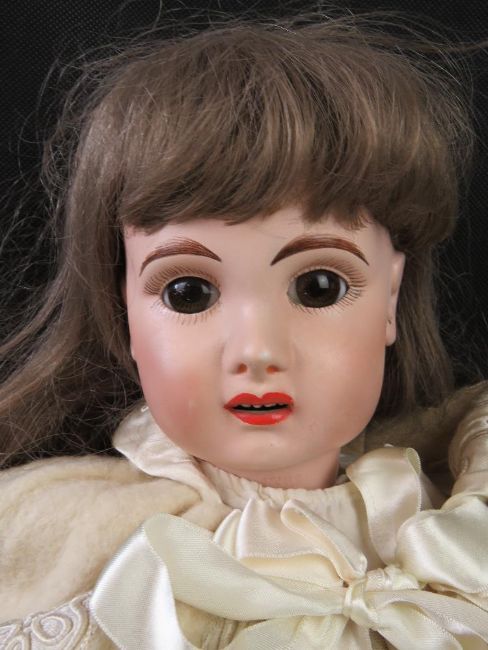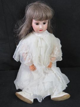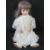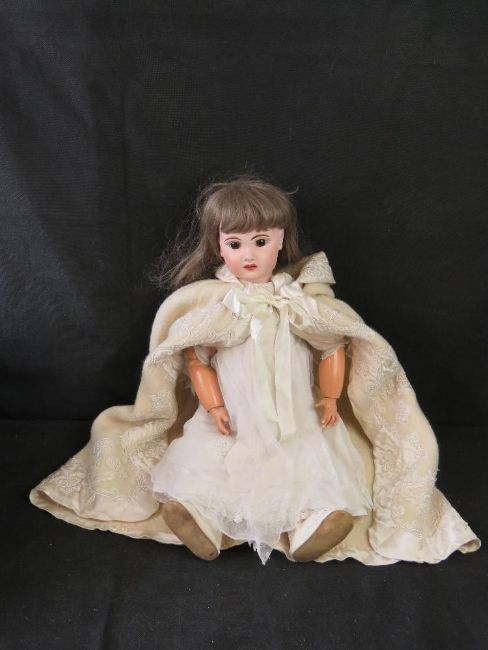 A bisque head doll having jointed limbs, brown eyes, open mouth with teeth and rosy cheeks.