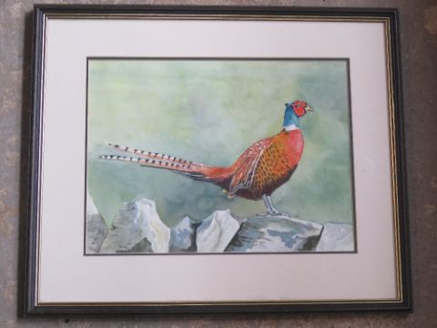 A watercolour painting of a pheasant, framed.