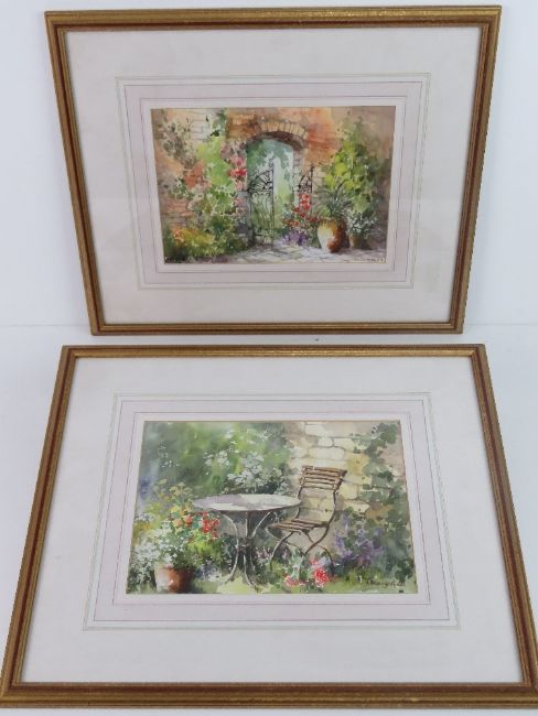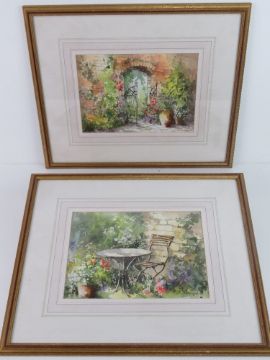 A pair of delightful watercolours, each being a garden scene, framed and mounted.