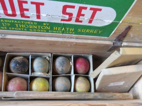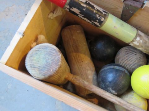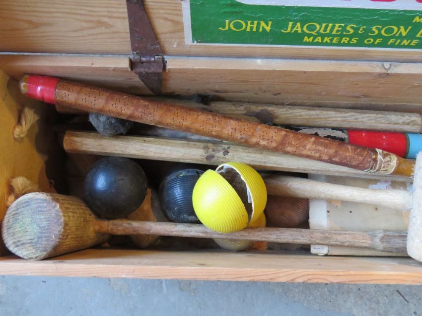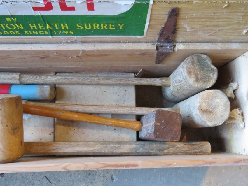 A Jaques croquet set including four matching mallets (one handle deficient), post, spare mallets, and assorted balls.