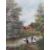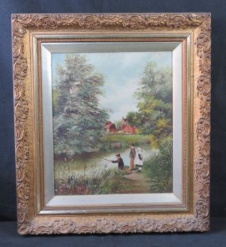Early 20th century oil painting signed M F Smith, riverside fishing scene with cottage in background, gilt wooden frame.